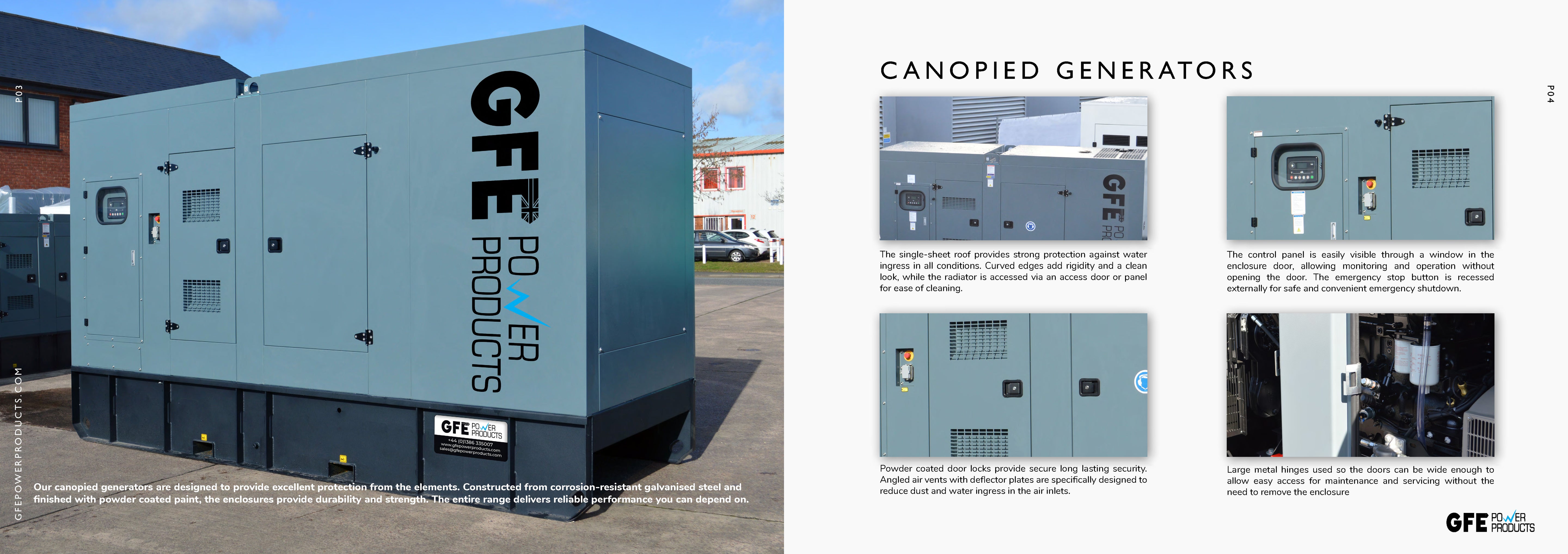 Our GFE Cummins Powered generators are enclosed in highly durable canopies, designed to protect the generator from environmental damage and reduce noise levels. The key features include: